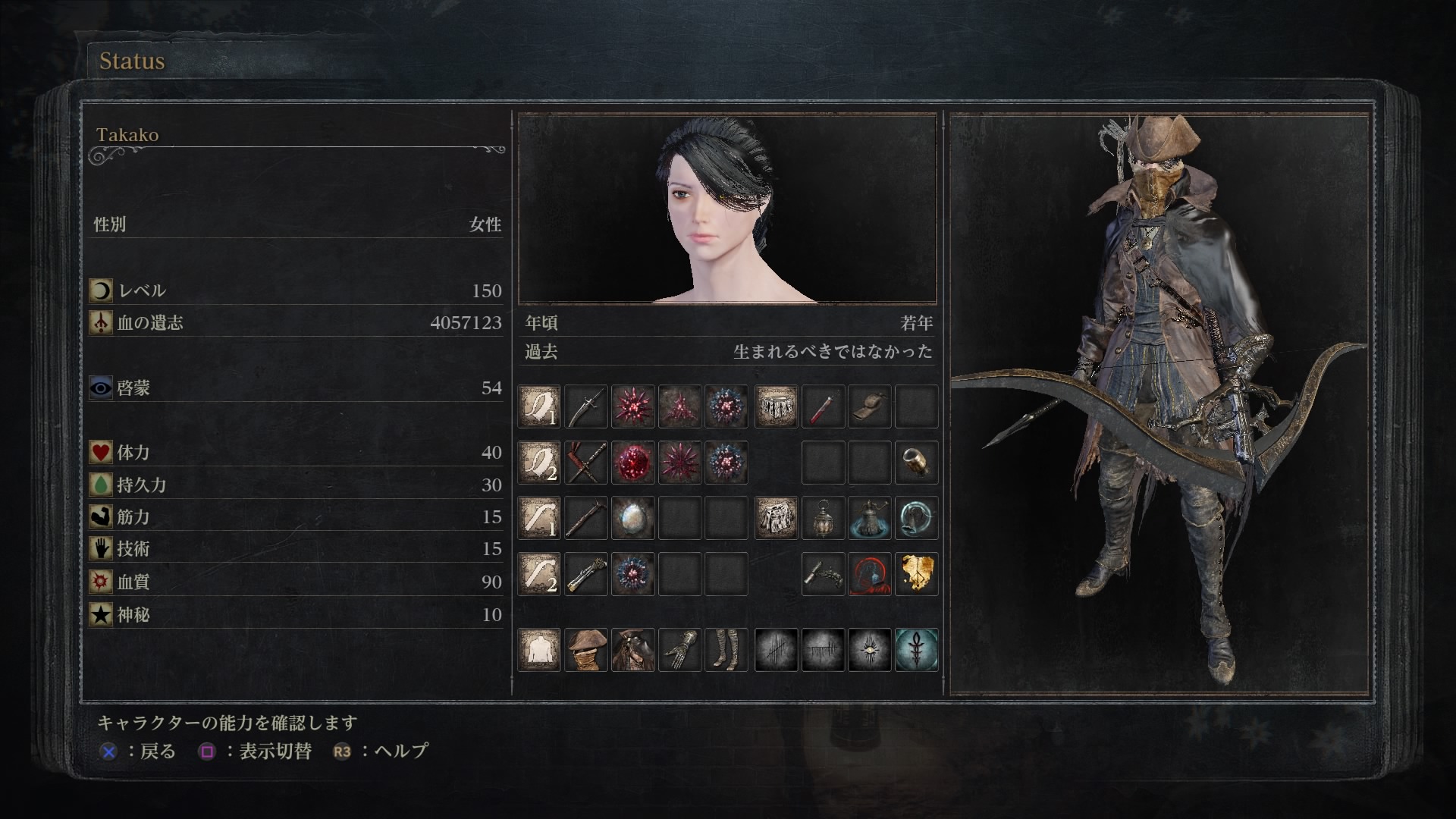 狩人takako Bloodborneとmhwで使っていたキャラ名をそのまま名乗っている ブラボのステ振りに関しては Sl150も上げるんなら血質70で止めて残りを技術に振っとけばよかった と絶賛後悔中 T Co 2x3mpex560 Twitter
